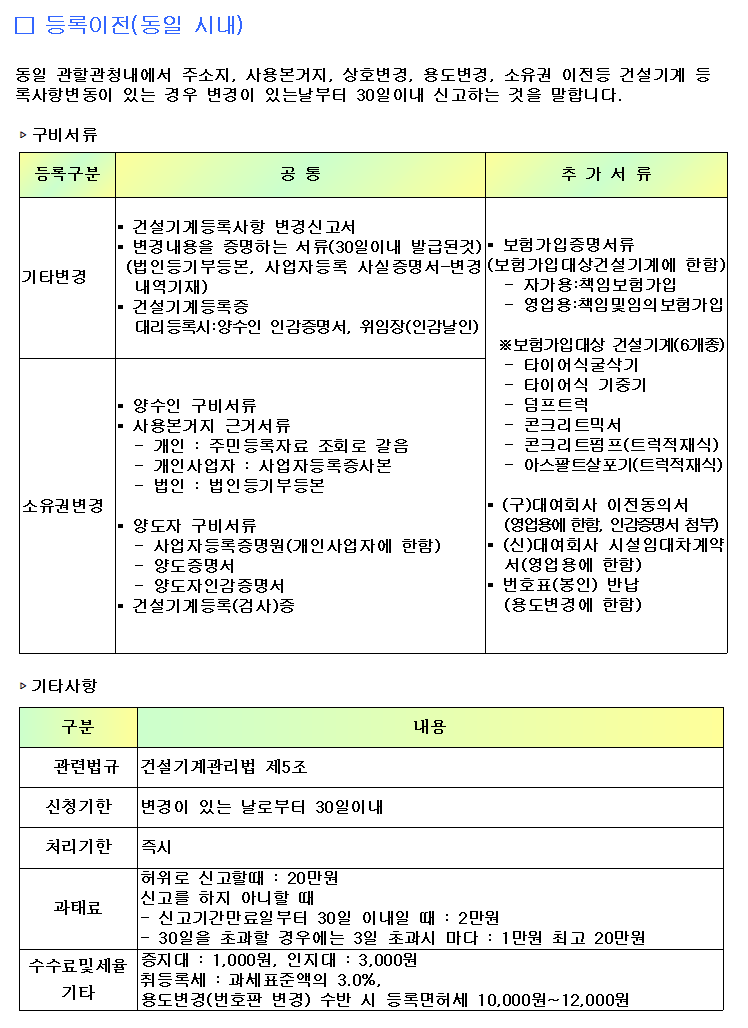 - 동일 관할관청내에서 주소지, 사용본거지, 상호변경, 용도변경, 소유권 이전등 건설기계 등록사항변동이 있는 경우 변경이 있는날부터 30일이내 신고하는 것을 말한다.