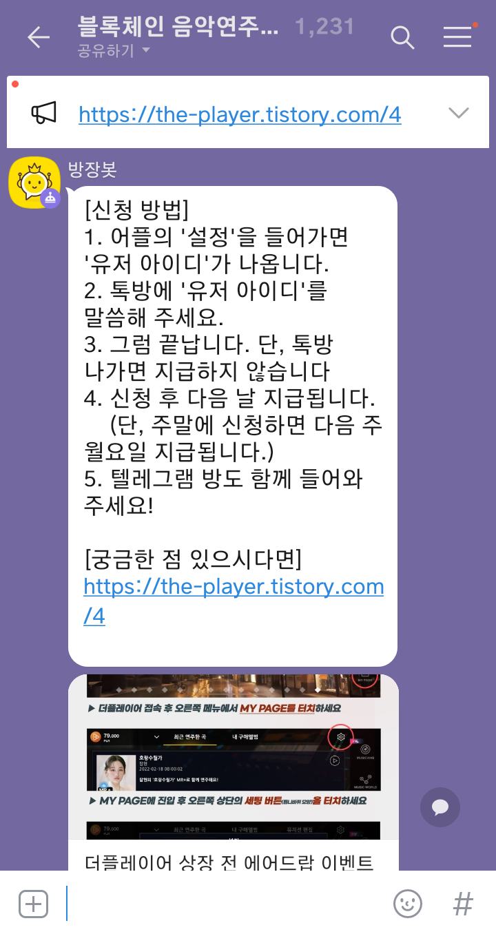 여기까지 했으면 에어드랍 신청은 완료! 톡방에서 올라올 더플레이어 소식을 기다리면 된다.