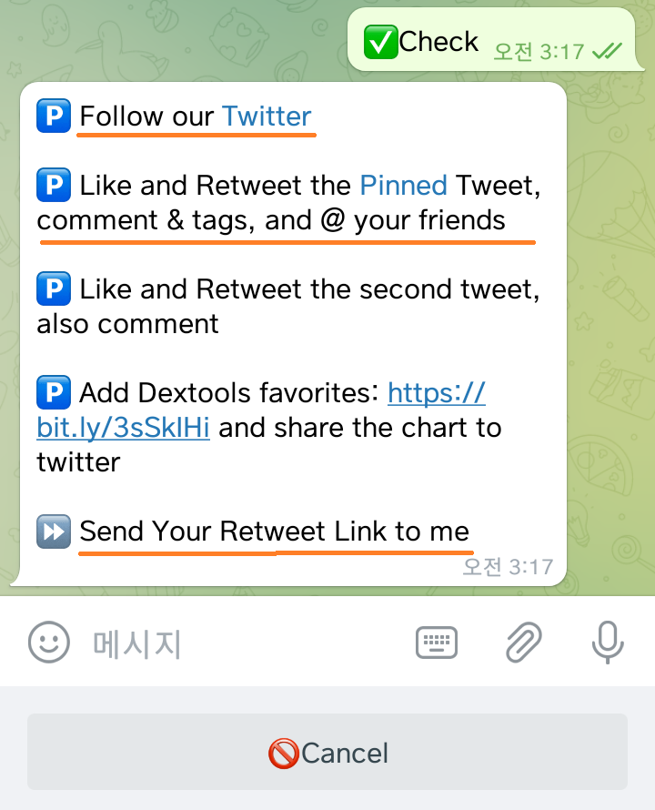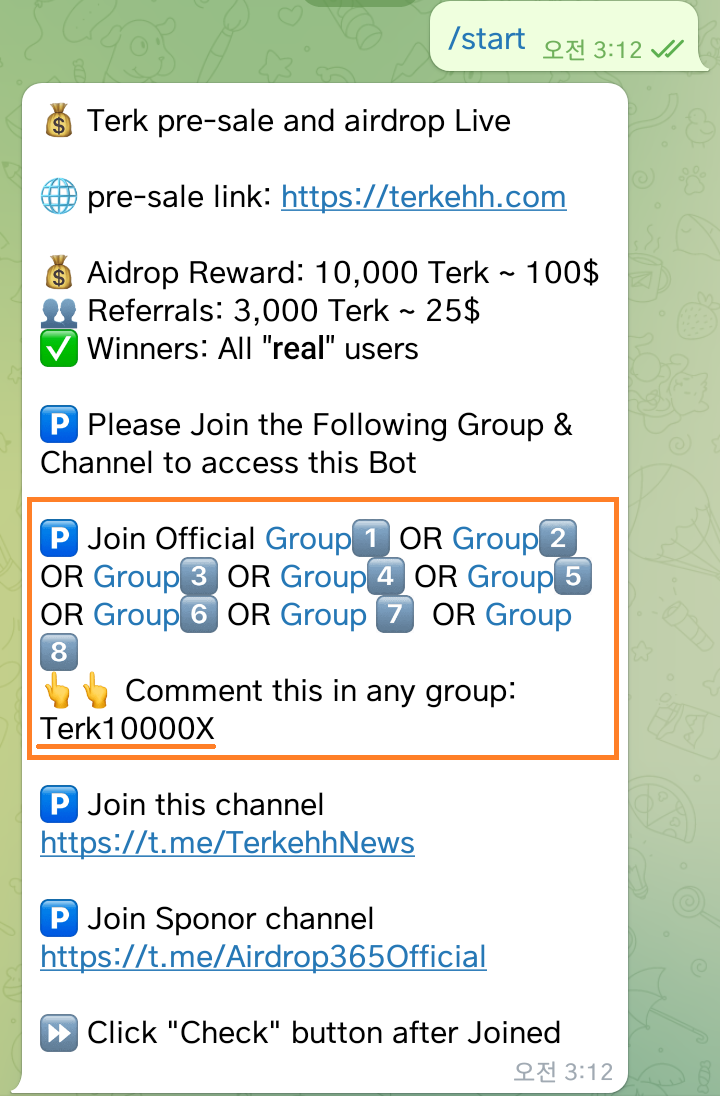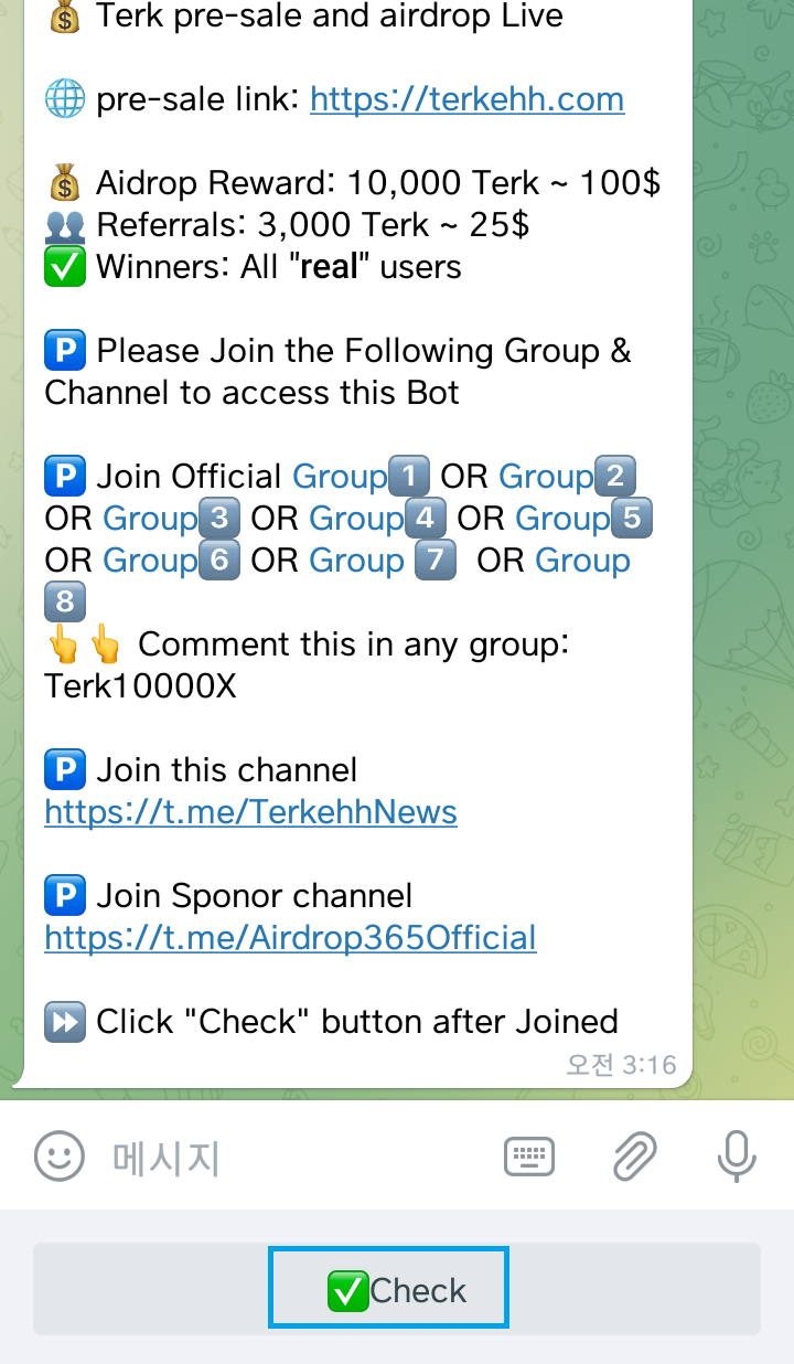 4) 텔레그룹 가입방으로 돌아와서 하단에 Check 클릭하기!
