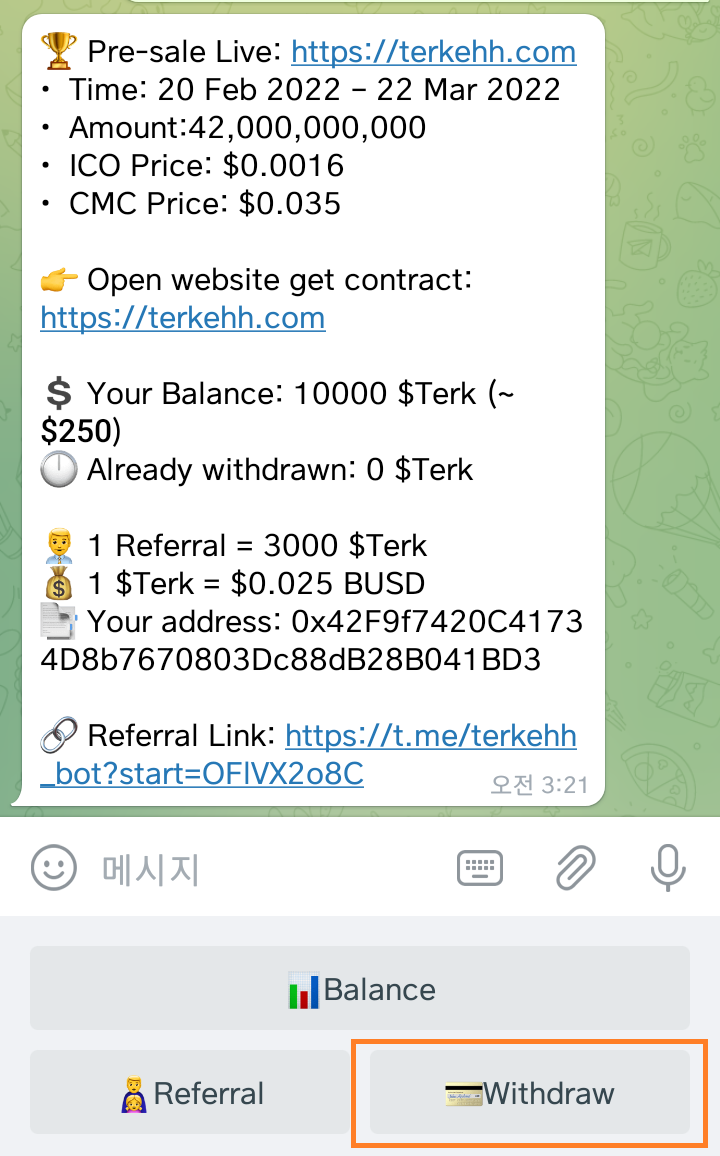 7) 트러스트월렛 또는 메타마스크에 만들었던 Terk 지갑주소 입력하기!