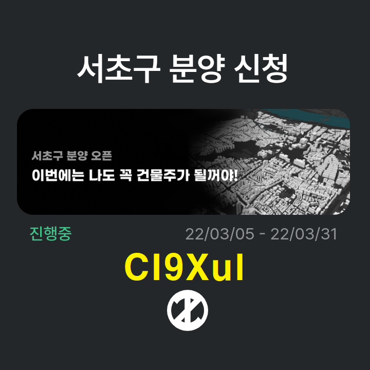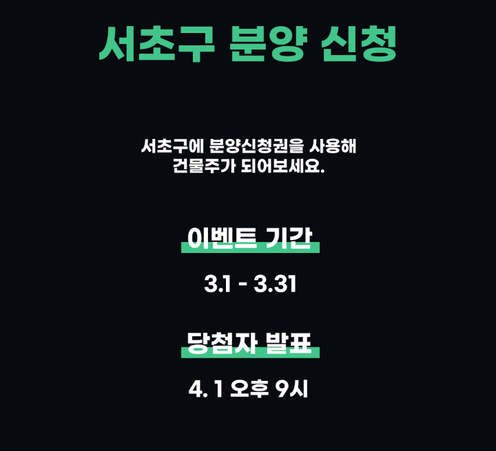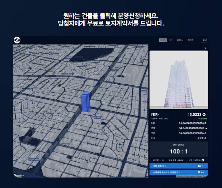 추천링크로 이동하여 카카오 계정으로 가입하고, 서초구에 있는 건물 중 분양 받고 싶은 건물을 클릭하고 분양 신청하면 된다. 가입할때 3장의 분양권이 지급되고, 초대코드를 입력하면 2장이 추가로 지급된다. 출석체크를 하면 매일 누적하여 분양신청권이 지급된다.