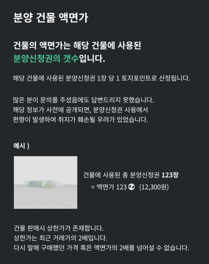 - 건물의 액면가는 해당 건물에 사용된 분양신청권의 갯수이다.