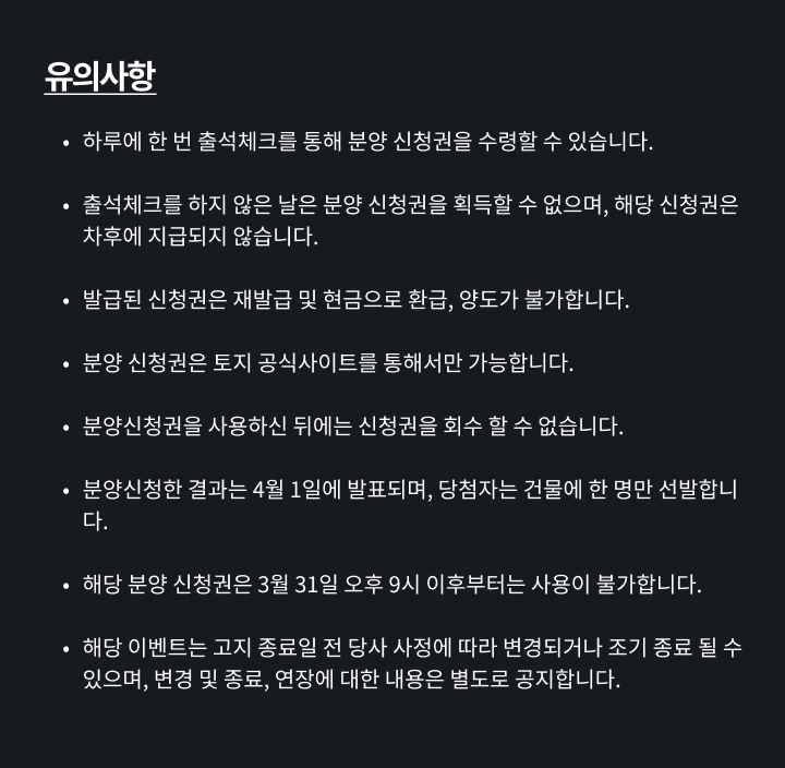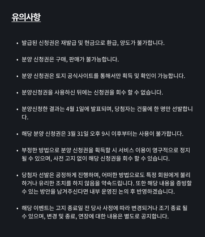 - 부정한 방법으로 분양 신청권을 획득할 시 서비스 이용이 영구적으로 정지될 수 있으며, 사전 고지 없이 해당 신청권을 회수 할 수 있다.