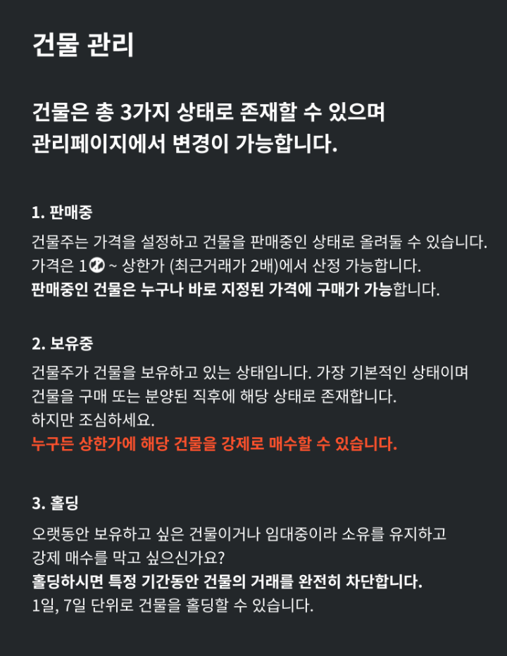 - 홀딩하면 특정 기간동안 건물의 거래를 완전히 차단한다.
