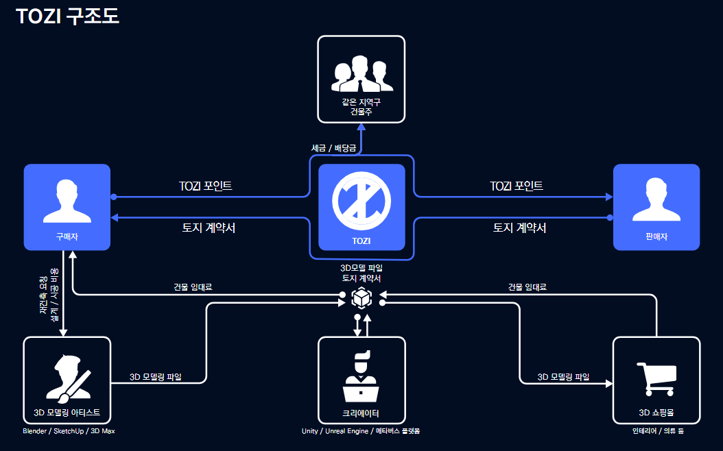 - 토지 (TOZI)는 메타버스 가상 부동산 플랫폼이다. 지구와 같은 크기의 메타버스를 구성하고, 인공지능을 통해 모든 도시와 건물을 설계합니다. 블록체인 기술을 활용하여 사람들과 거래가 가능합니다. TOZI의 메타버스 부동산이 가상 자산을 대표할 때까지 메타버스 내에 부동산이라는 가상 자산 개념을 만들어낸 것입니다!