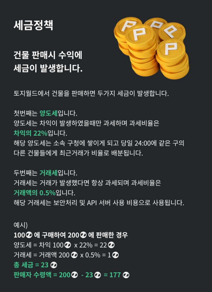 - 건물의 구매, 판매, 임대, 세금 등 토지월드 내에서의 모든 곙제활동은 토지포인트를 통해 이루어진다.