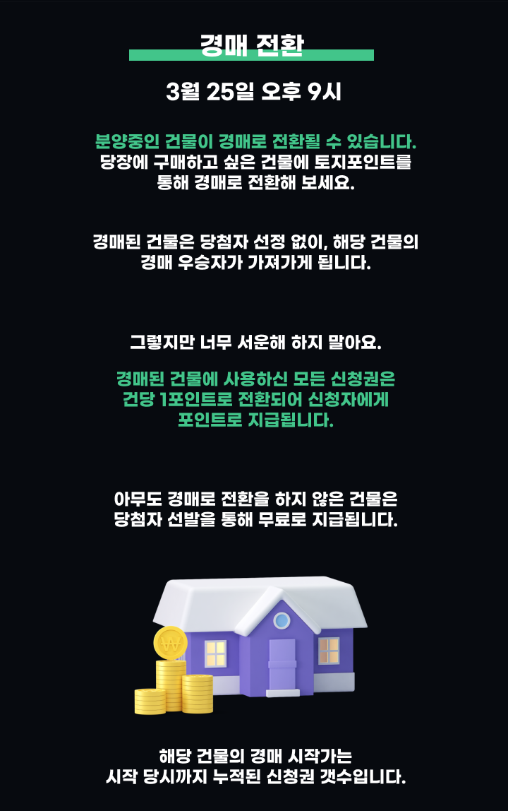 - 분양중인 건물이 경매로 전환될 수 있다. 구매하고 싶은 건물에 토지포인트를 통해 경매로 전환할 수 있다.