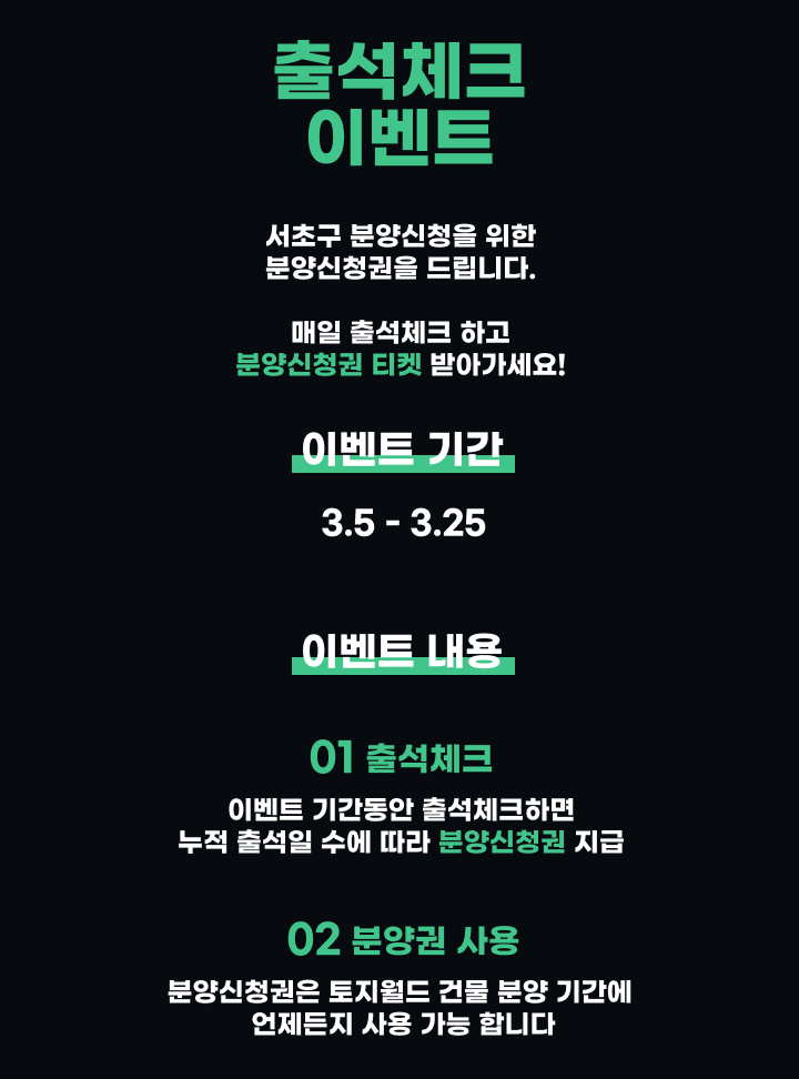 - 출석체크를 하면 누적 출석일 수에 따라 서초구 분양신청을 위한 분양신청권을 지급한다.