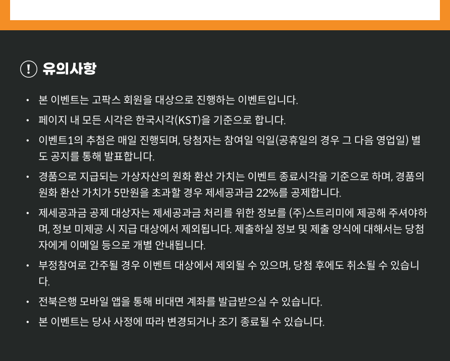 - 경품으로 지급되는 가상자산의 원화 환산 가치는 이벤트 종료시각을 기준으로 하며, 경품의 원화 환산 가치가 5만원을 초과할 경우 제세공과금 22%를 공제한다.