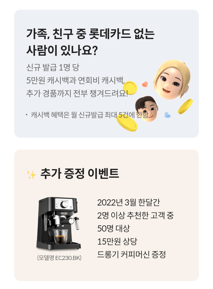 - 2022년 3월 한달간중 2명이상 추천한 고객 중 50명 대상 15만원 상당 드롱기 커피머신 증정