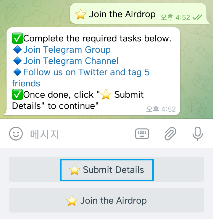 에어드랍을 받기위해서는 텔레그램 그룹/채널 가입, 트위터 팔로우 및 리트윗, 친구 3명 테그, 메타마스크 지갑 주소 입력하면 된다.