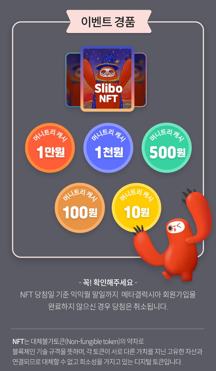 - 돌림판 이벤트는 하루에 1번, 터치 한 번으로 머니트리 캐시 10원부터 1만원, Slibo NFT까지 100% 확률로 받을 수 있다.