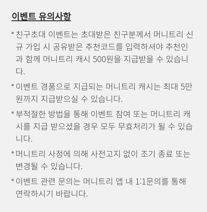 - 친구초대 이벤트는 초대받은 친구가 머니트리 신규가입 시 공유받은 추천코드를 입력해야 친구와 함께 머니트리 캐시 500원을 지급 받을 수 있다.