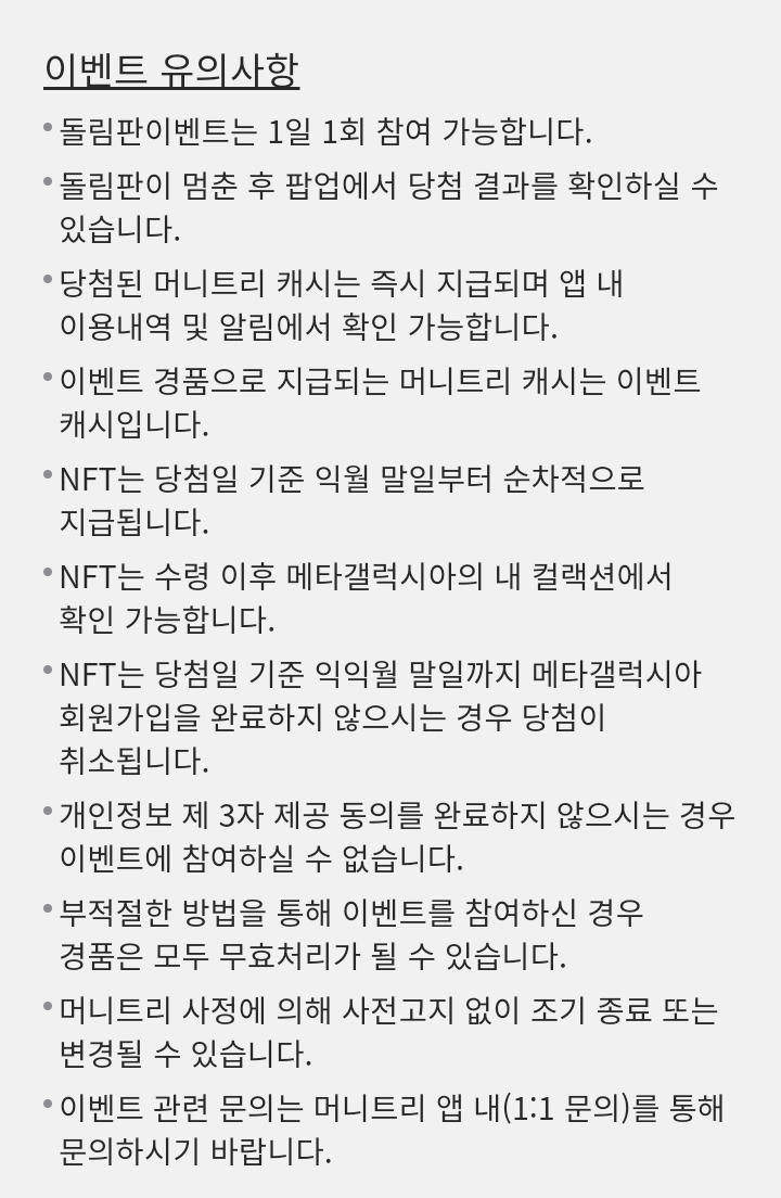 - 부적절한 방법을 통해 이벤트 참여 또는 머니트리 캐시를 지급 받았을 경우 모두 무효처리가 될 수 있다.