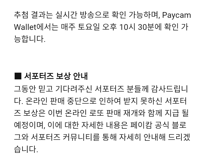 - 추첨 결과는 실시간 방송으로 확인 가능하며, Paycam Wallet에서는 매주 토요일 오후 10시 30분에 확인 가능하다.