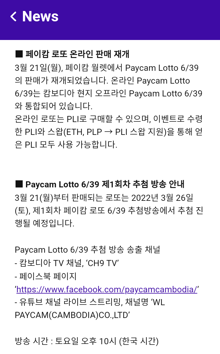 - 3월 21일(월), 페이캄 월렛에서 Paycam Lotto 6/39의 판매가 재개되었다. 온라인 Paycam Lotto 6/39는 캄보디아 현지 오프라인 Paycam Lotto 6/39와 통합되어 있다.