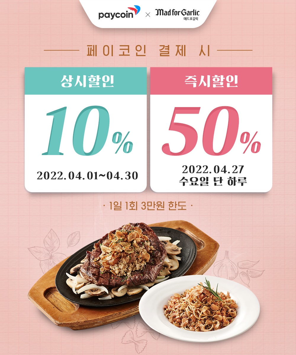 - 전 메뉴 50% 할인(1일 1회 3만원 한도) : 2022.04.27