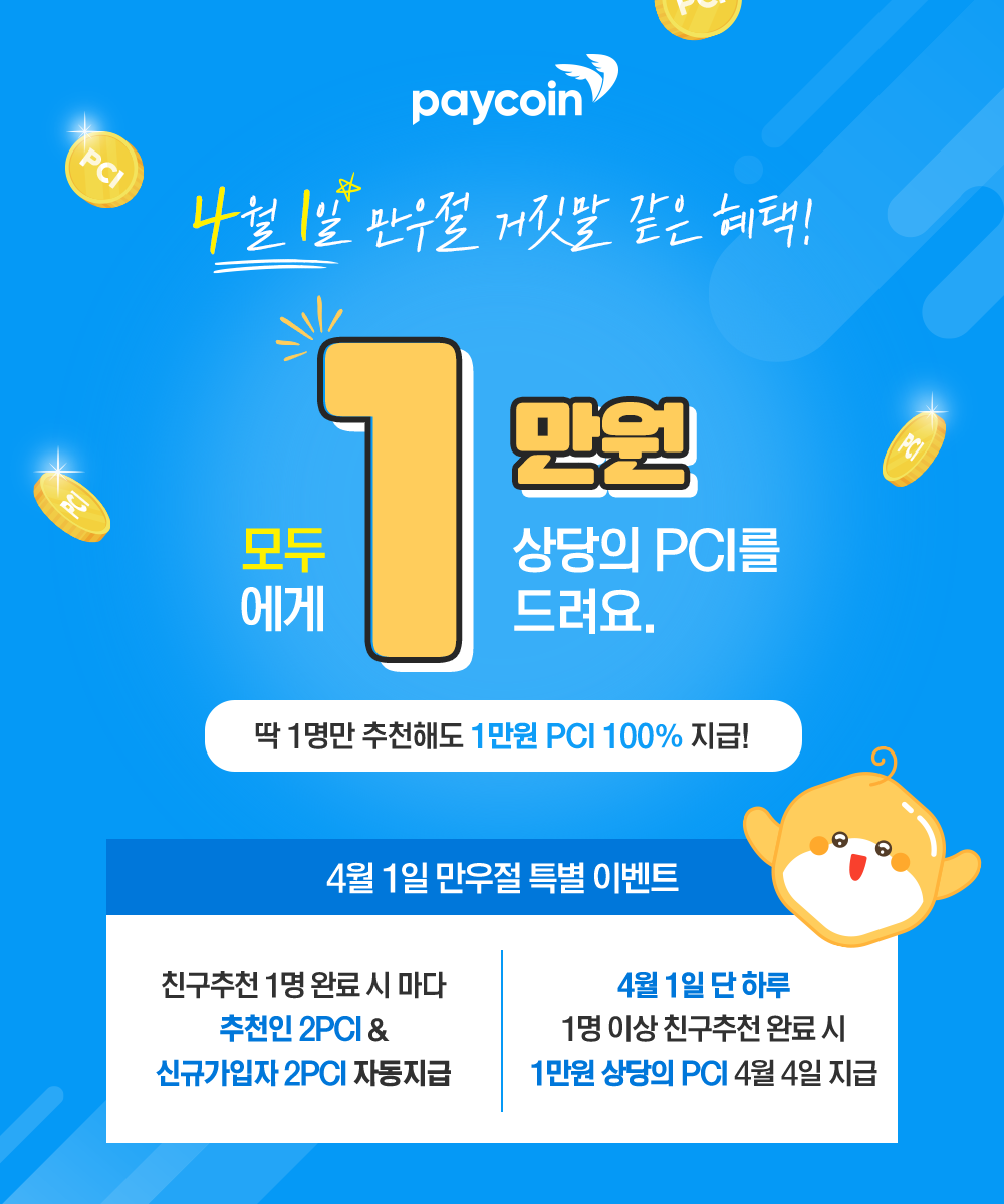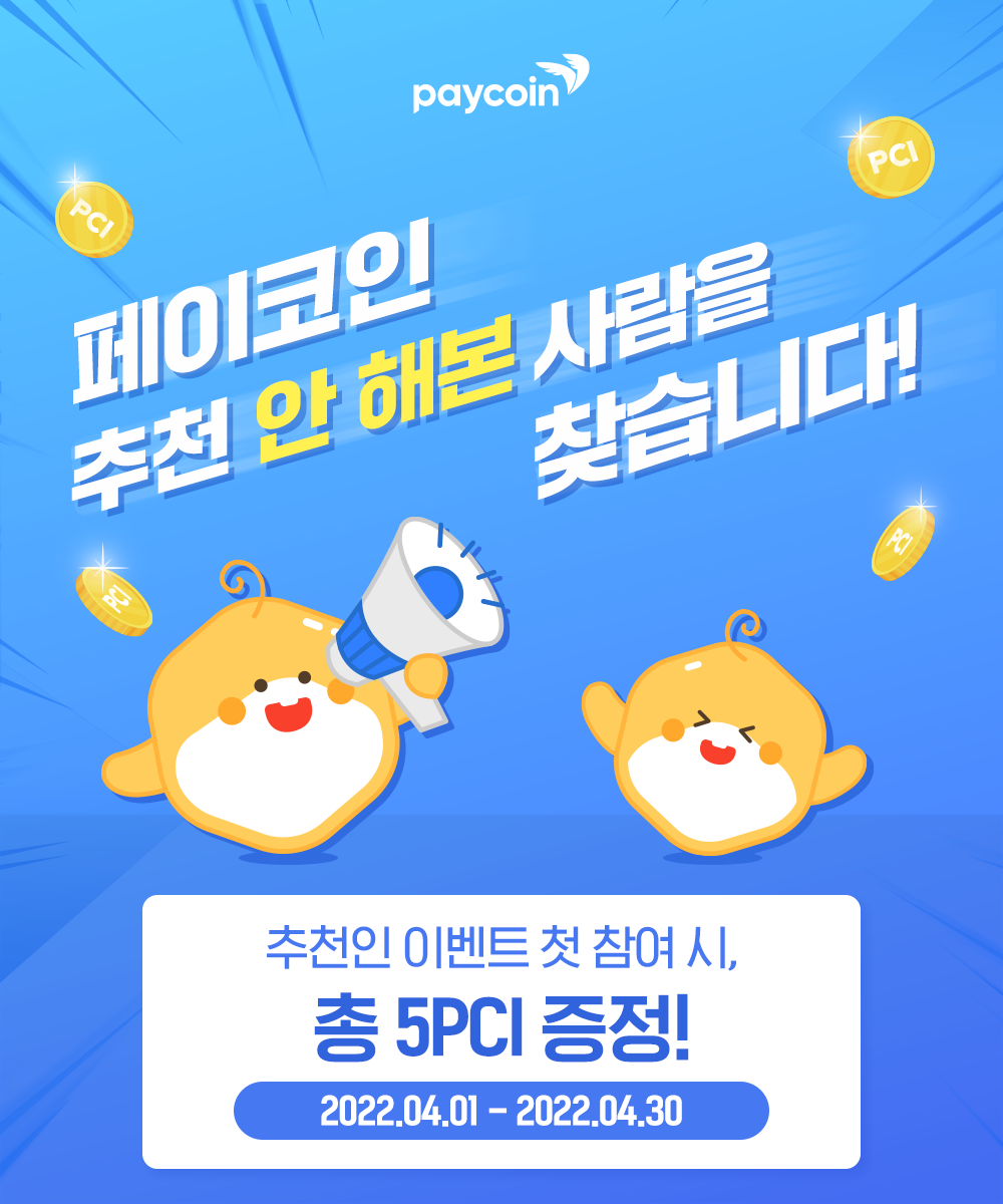 2022년 4월 페이코인 친구추천 이벤트 4.2~4.30 동안 진행된다. 추천코드 입력시 친구과 추천인에게 2PCI 리워드 즉시 자동지급 된다. 페이코인에서 할인, 페이백, 출석 룰렛이벤트 등의 다양한 이벤