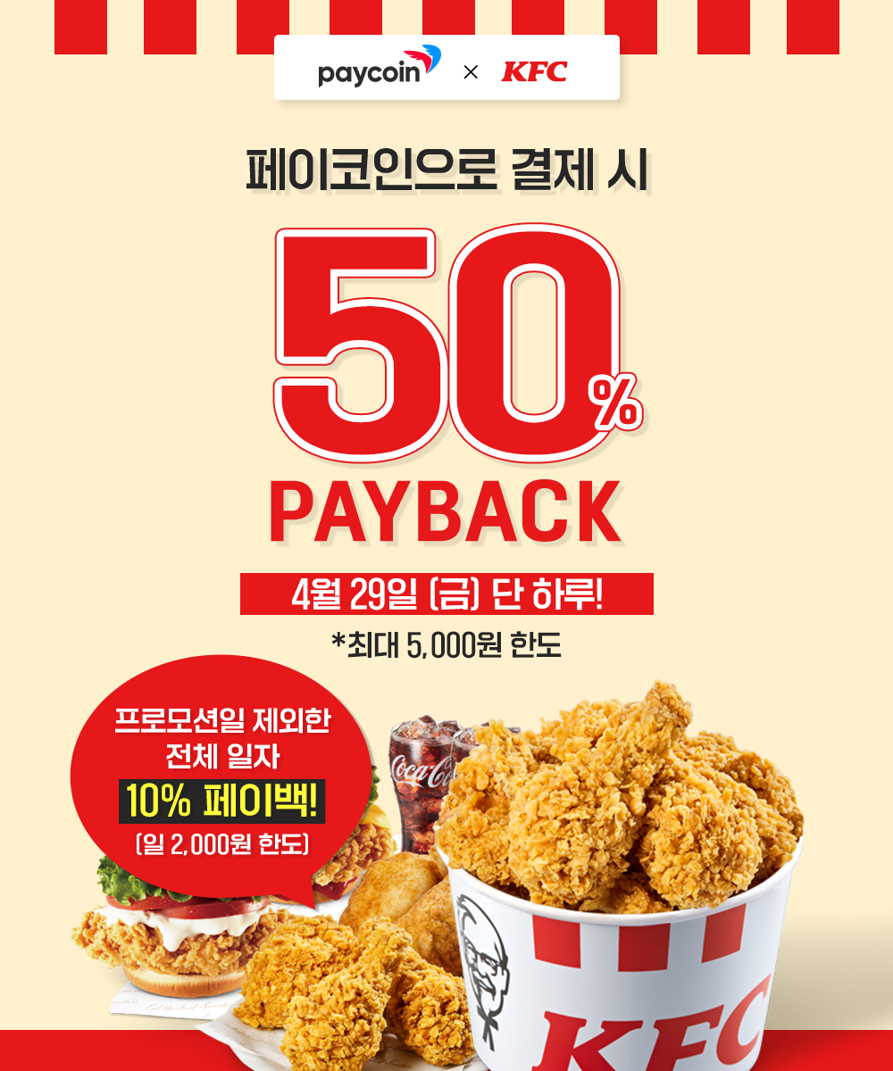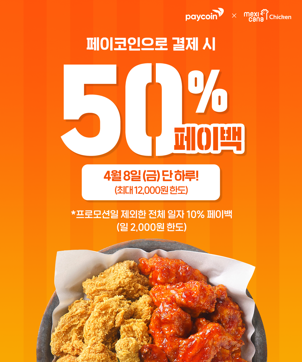 * 50% 페이백 특별 프로모션은 4월 6일 (수) ~ 7일 (목) 2일 간 진행되며, 1일 페이백 최대 한도가 12,000원으로 2일 모두 결제 시 최대 24,000원을 페이백 받으실 수 있다.