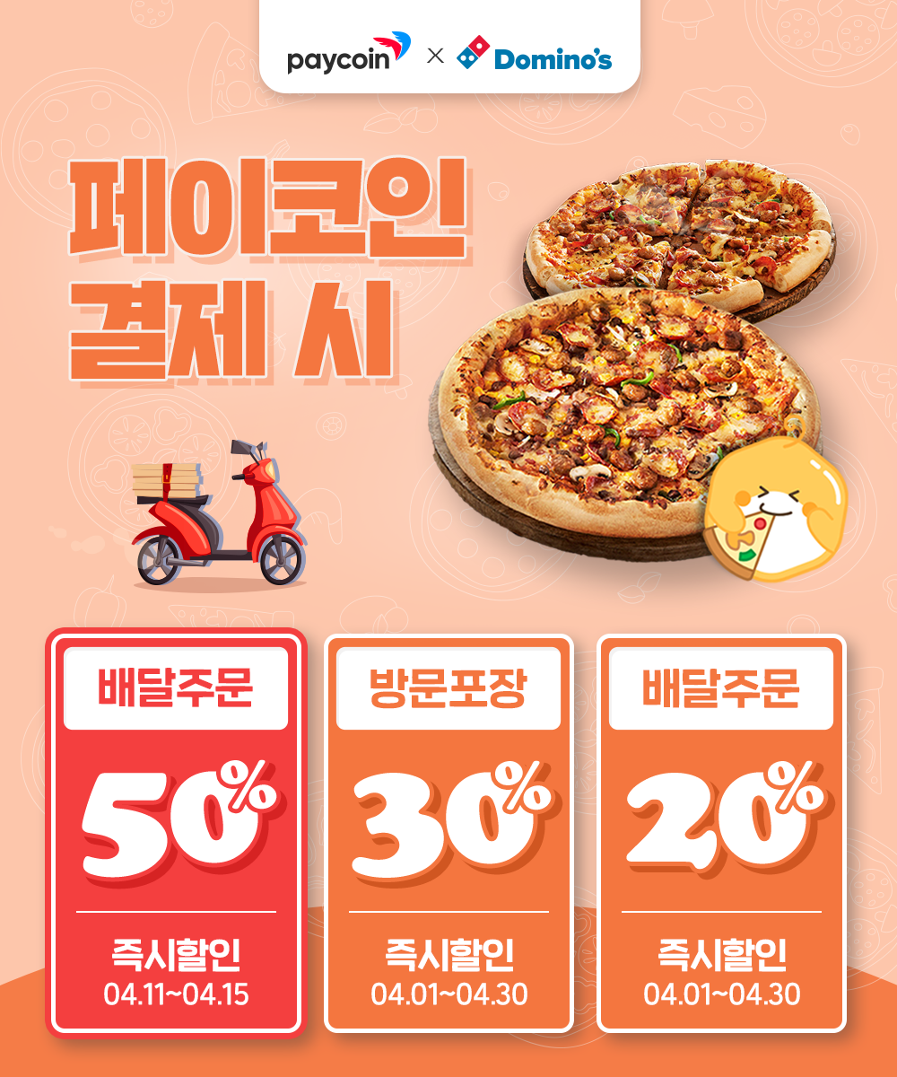 도미노피자에서 페이코인으로 결제 시, 배달주문 50% 할인 이벤트를 진행.