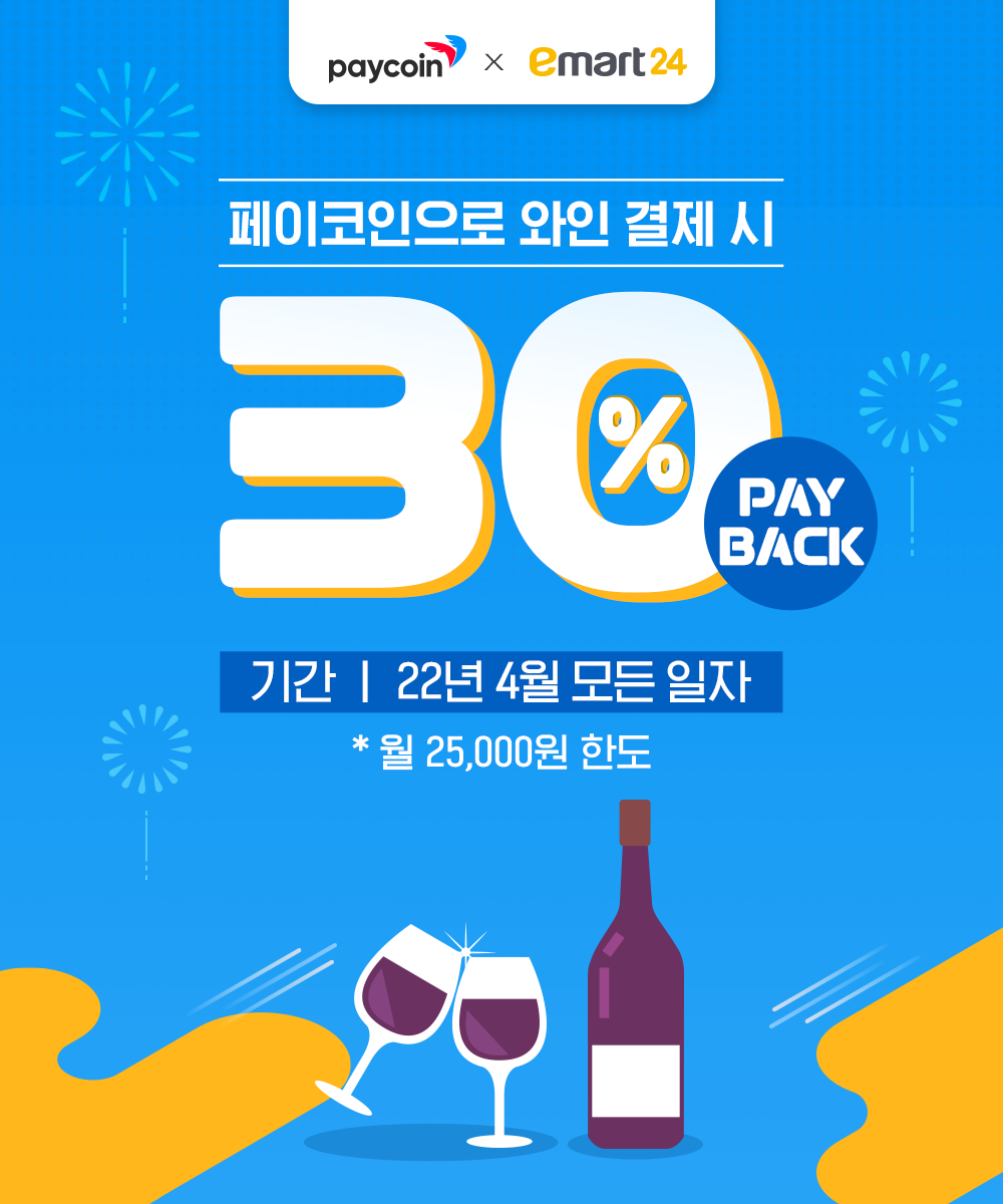 * 본 프로모션은 이마트24 오프라인 매장에서 2022년 04월 전체 일자에 구매한 와인 결제 금액 합산의 30%를 페이백드리는 이벤트이며 월 페이백 최대 한도는 25,000원.