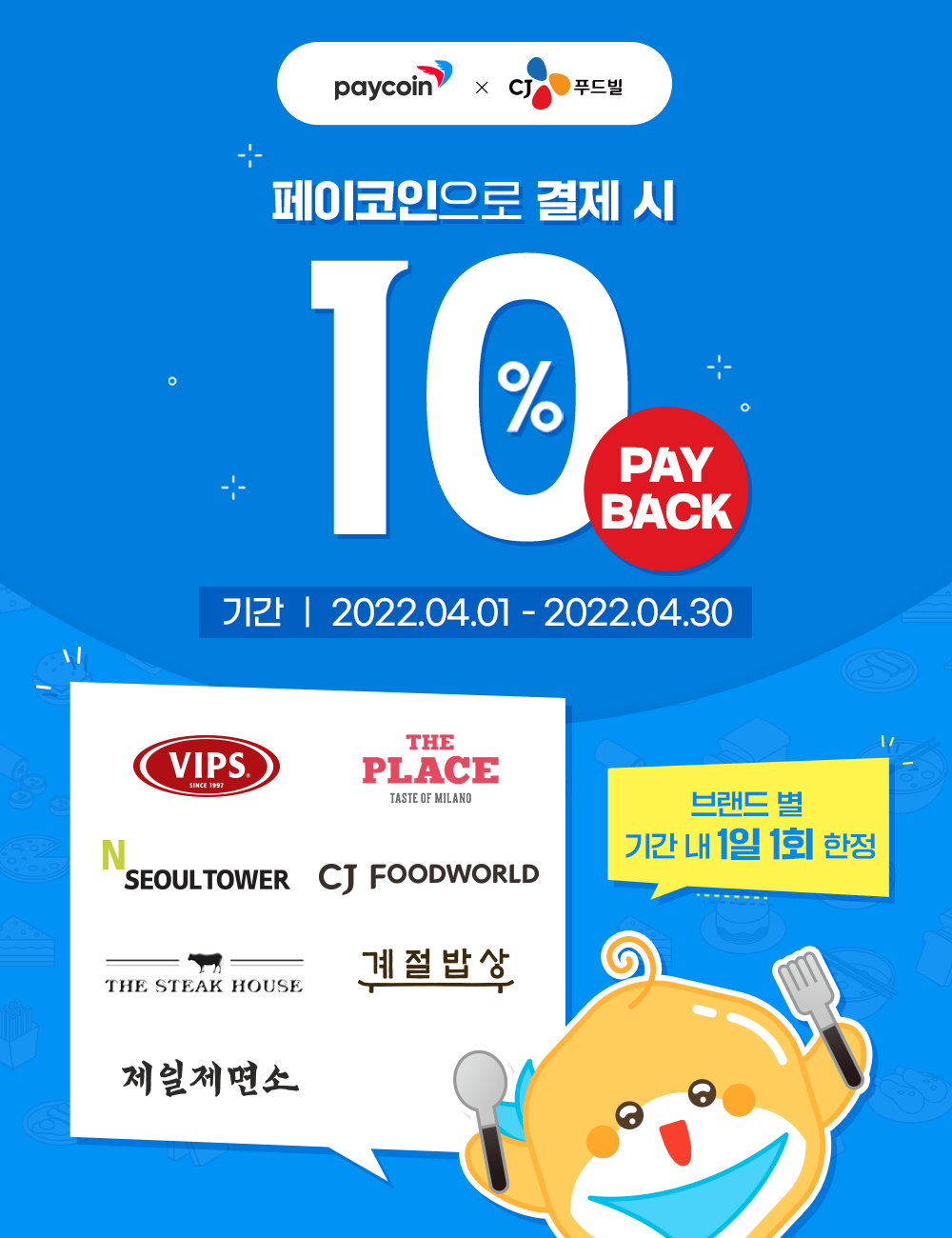 - 전 메뉴 10% 할인(1일 1회 3만원 한도) : 2022.04.01 ~ 2022.04.30