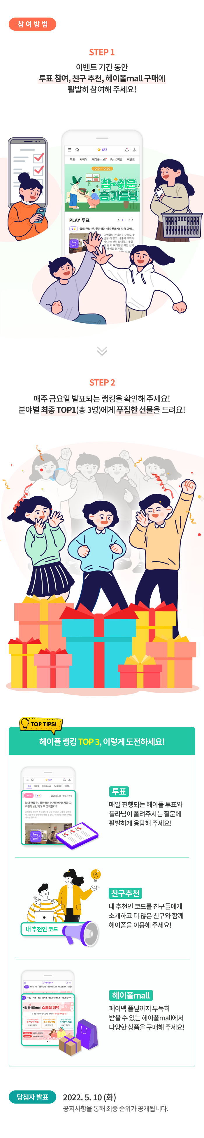 - 본 이벤트는 분야별(투표 참여/친구 추천/헤이폴mall 구매) 최종 TOP1 한 명에게 이벤트 경품이 제공. (총 3명에게 지급)