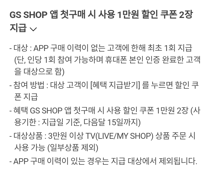 - 혜택 GS SHOP 앱 첫구매 시 사용 할인 쿠폰 1만원 2장 (사용기한 : 지급일 기준, 다음달 15일까지)