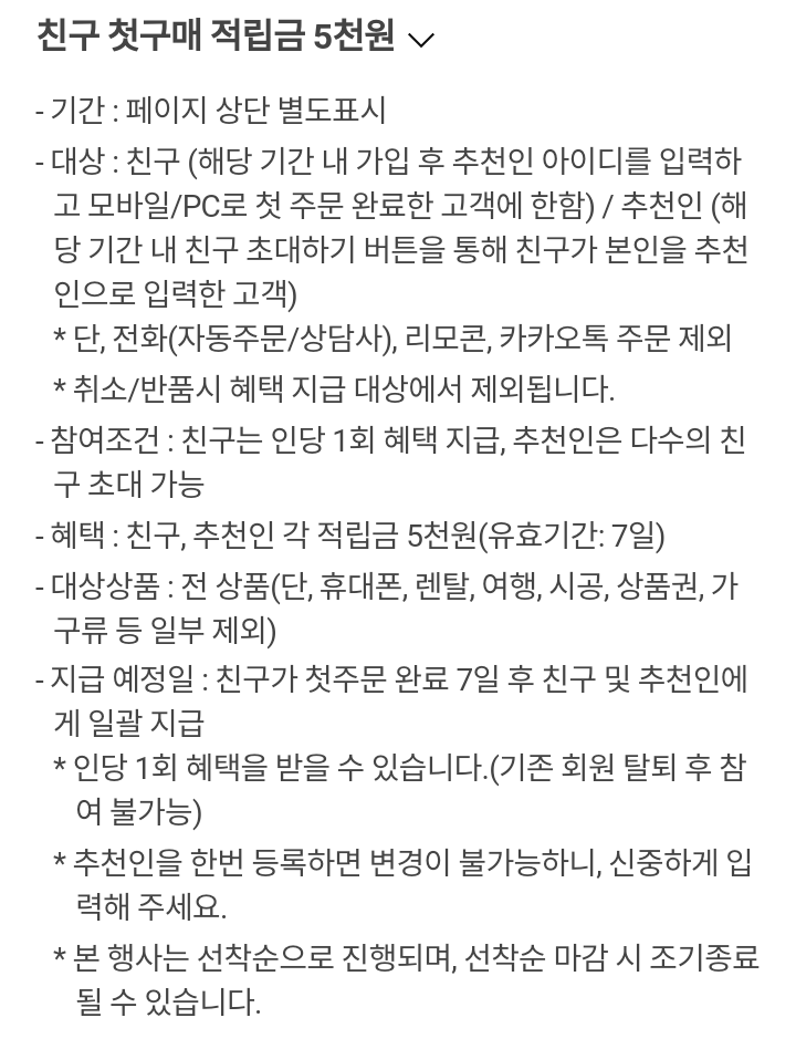 - 혜택 : 친구, 추천인 각 적립금 5천원(유효기간 7일)