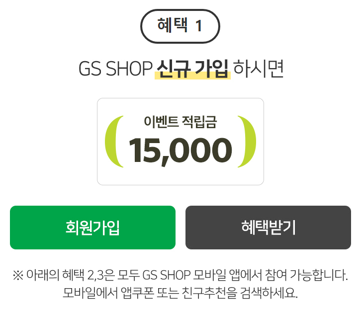 GS SHOP에서 가입축하금 1만 5천원과 추가혜택을 받아보세요.