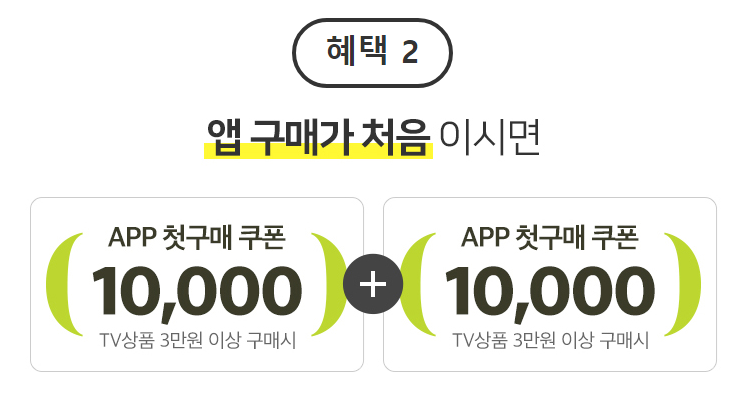 - 혜택2 : APP 첫구매 쿠폰 1만원(x2장)