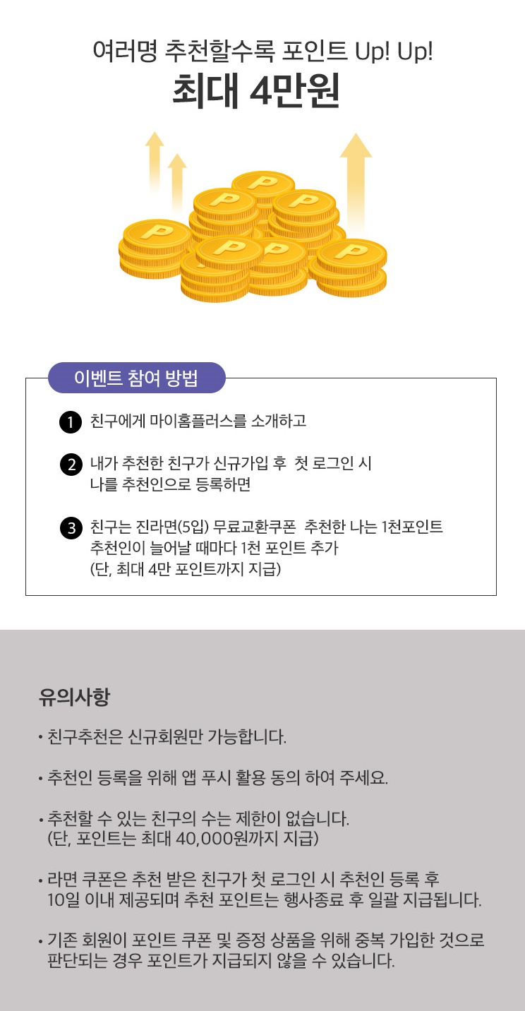 - 라면 쿠폰은 추천 받은 친구가 첫 로그인 시 추천인 등록 후 10일 이내 제공되며 추천 포인트는 행사종료 후 일괄 지급된다.