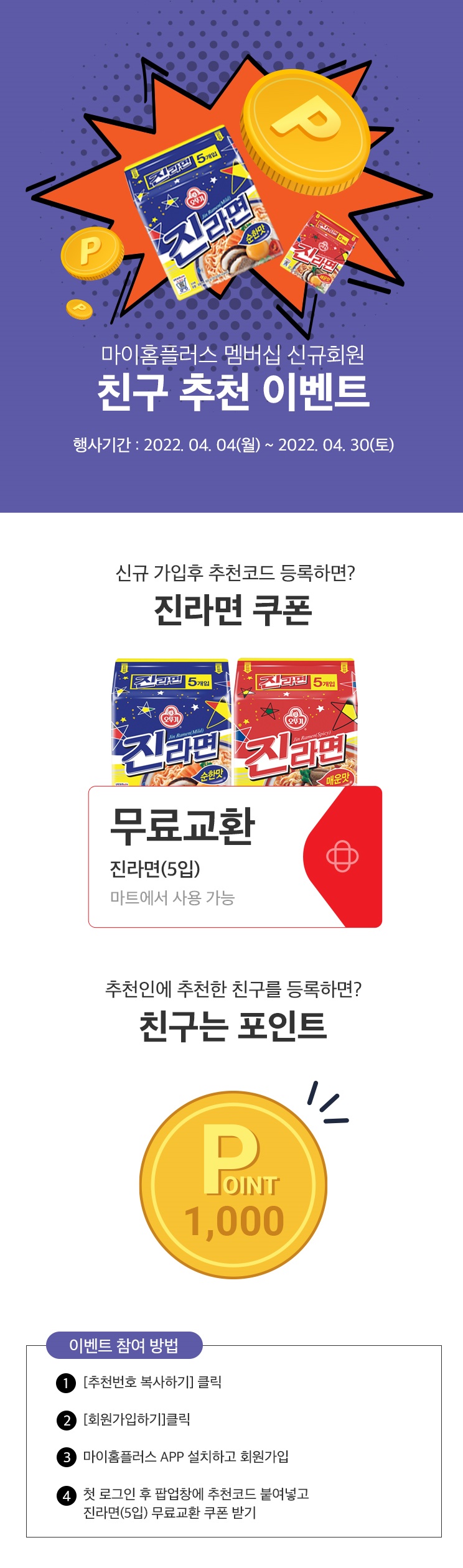 ③ 친구는 진라면 무료교환쿠폰, 나는 1천포인트 적립