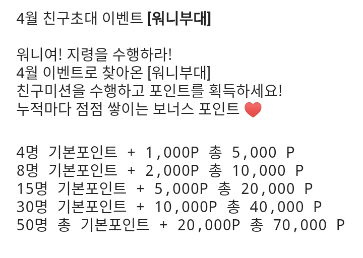 워너아이(wanna-i)에서 4월 친구초대 이벤트, 워니부대를 4월 30일까지 진행하고 있다. 워니부대는 4월 초대한 친구에 따라 기본 포인트에 추가 포인트가 지급된다.