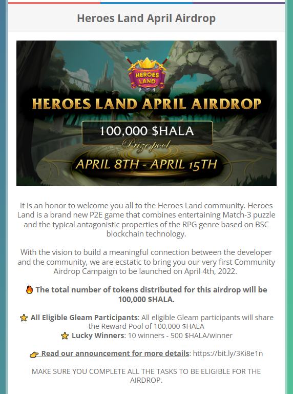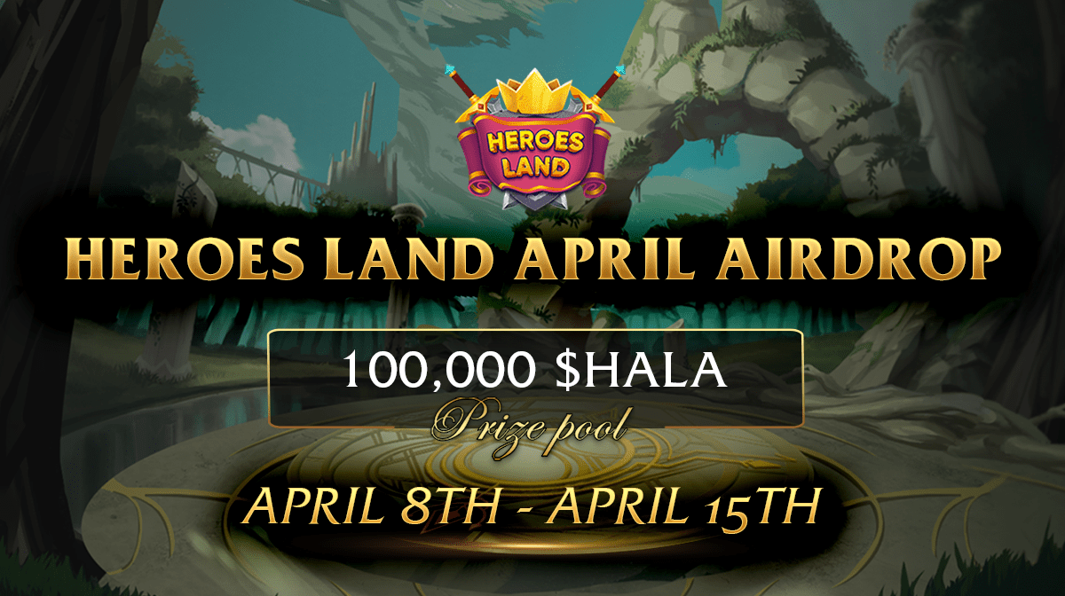 히어로즈 랜드(Heroes Land) 100,000 $HALA 에어드랍 이벤트를 4월 8일~4월 15일 동안 진행한다. Heroes Land는 BSC 기반으로 Match-3 퍼즐과 RPG 장르를 결합한 NFT P2E 게임이다.