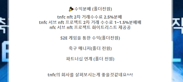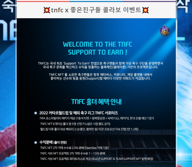 - 레전드스타와 함께하는 축구 NFT 프로젝트, TNFC는 국내 최초 'Support To Earn' 컨셉으로 축구팬들과 함께 가상 축구 구단을 운영하면서 국내 축구 문화를 혁신하고 수익을 창출하는 클레이튼 기반의 프로젝트이다.