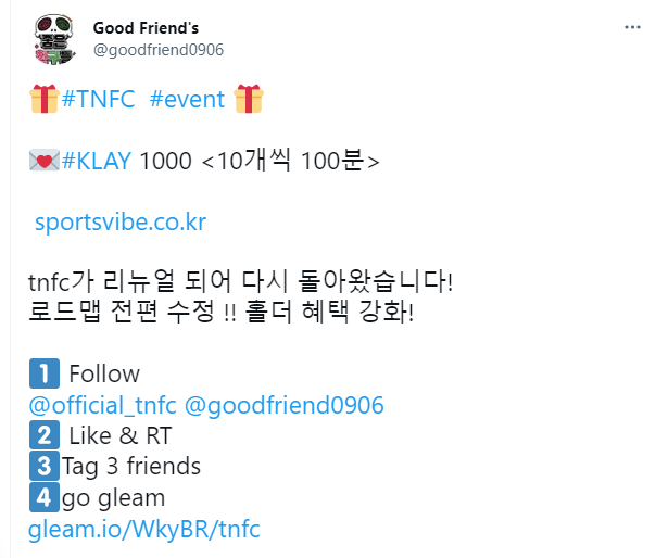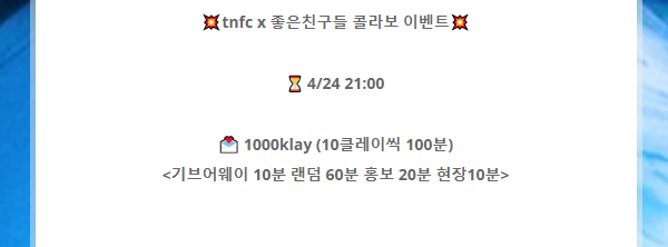 TNFC x 좋은친구들 콜라보 1,000 Klay 에어드랍 이벤트가 4월 10일 ~ 4월 24일 동안 진행된다.