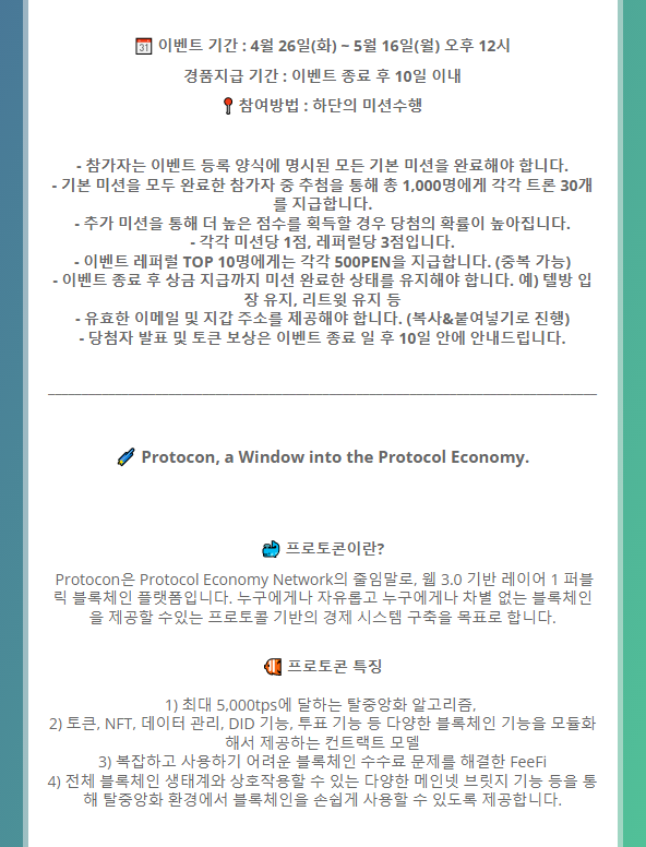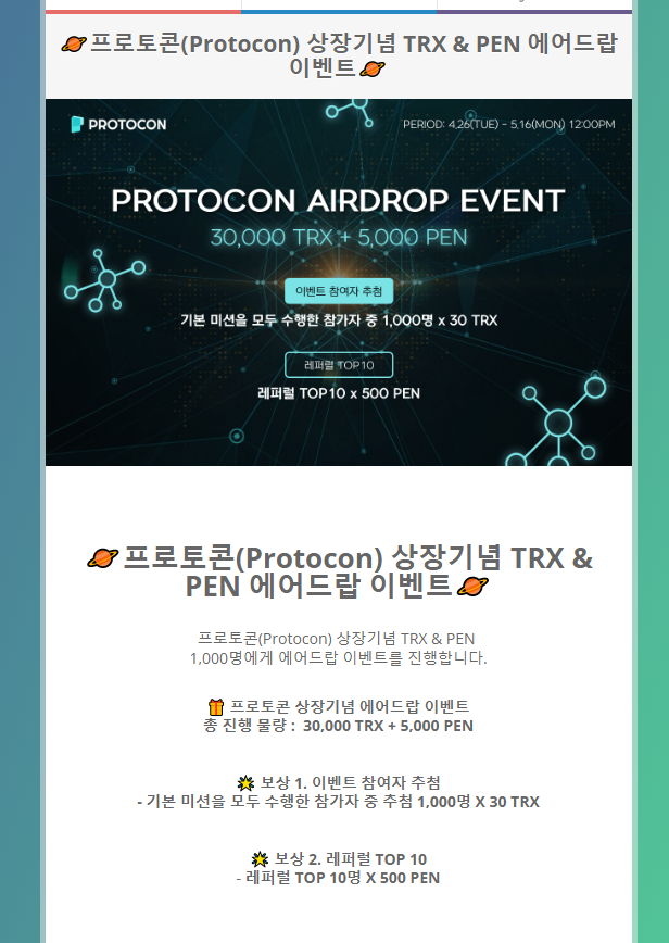 프로토콘(Protocon) 상장기념 TRX & PEN 에어드랍 이벤트가 4.26 ~ 5.16 동안 진행된다.