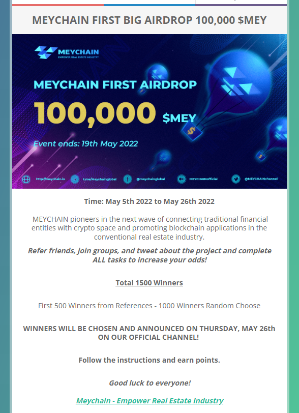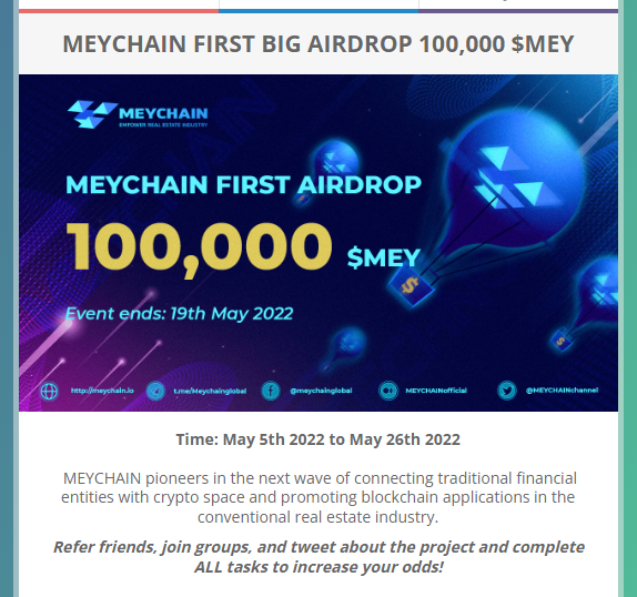 MEYCHAIN 100,000 MEY 에어드랍 이벤트가 5.5 ~ 5.26 까지 진행된다.