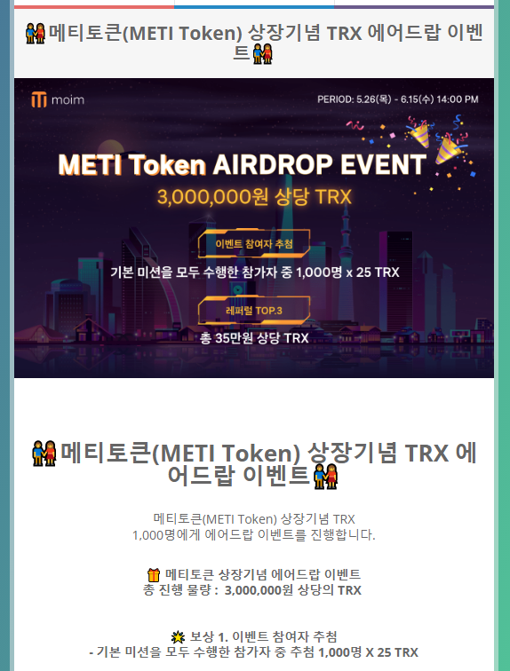 메티토큰(METI Token) 상장기념 TRX 에어드랍 이벤트에 참여해보세요.