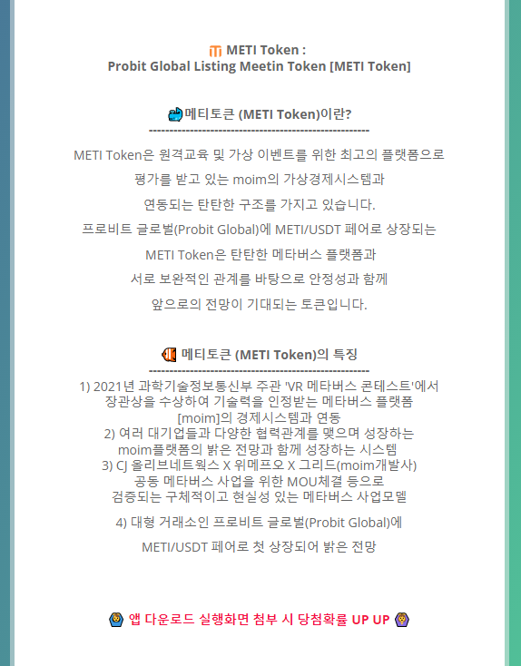 - 프로비트 글로벌(Probit Global)에 METI/USDT 페어로 상장되는 METI Token은 탄탄한 메타버스 플랫폼과 서로 보완적인 관계를 바탕으로 안정성과 함께 앞으로의 전망이 기대되는 토큰입니다.
