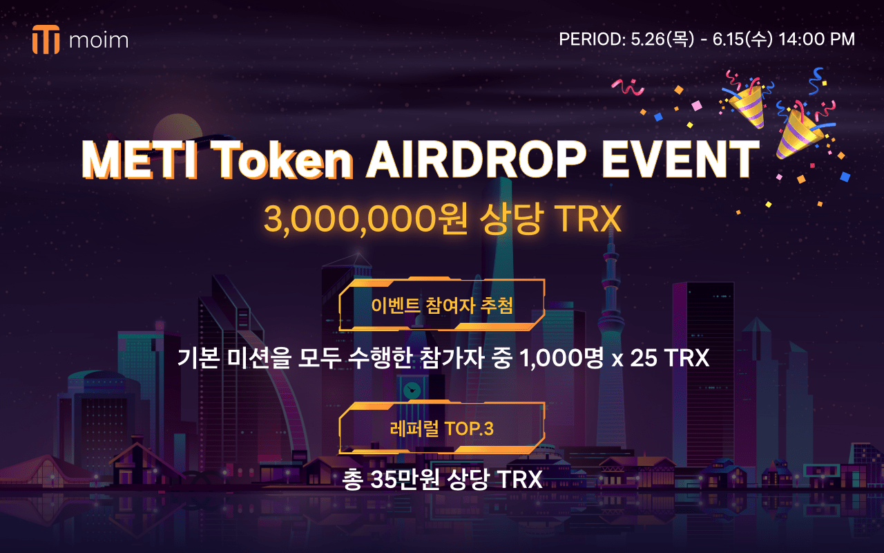 메티토큰(METI Token) 상장기념 TRX 에어드랍 이벤트가 5.26 ~ 6.15 까지 진행된다.