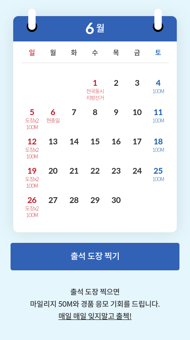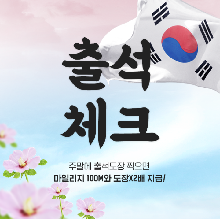 - 매일 출석체크를 하면 출석도장과 마일리지(평일 50M, 주말 100M)가 적립된다.