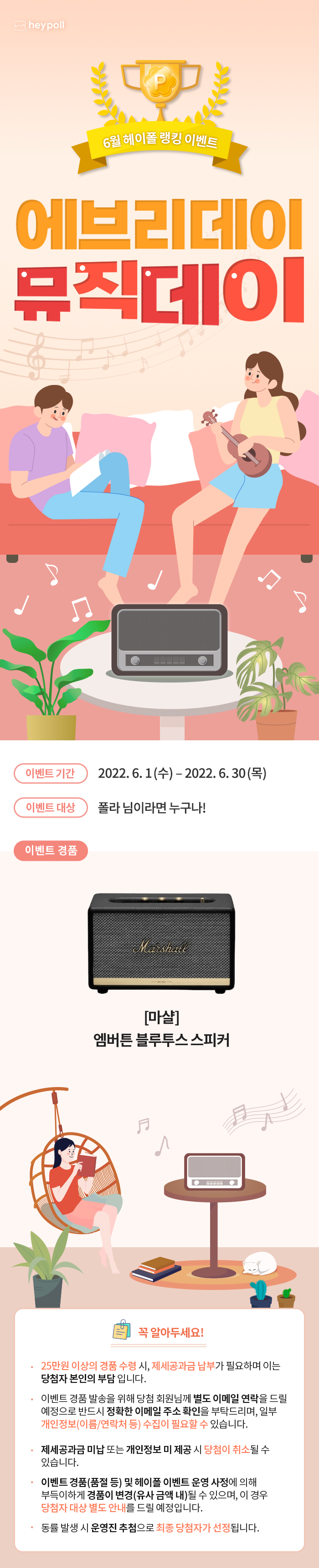 헤이폴에서 6월 랭킹 이벤트(에브리데이, 뮤직데이!, 6.1~ 6.30)가 진행중이다. 랭킹 이벤트 경품으로 마샬 엠버튼 블루투스 스피커가 지급된다.