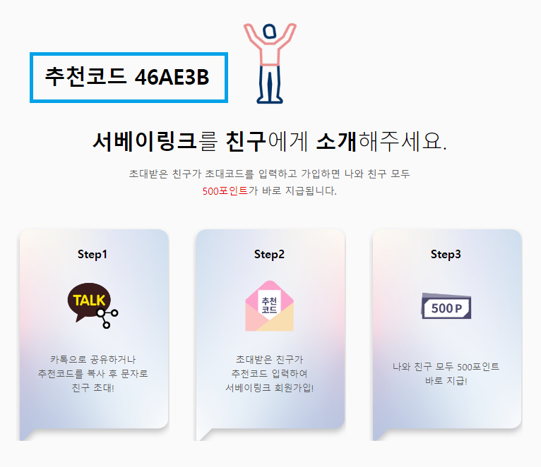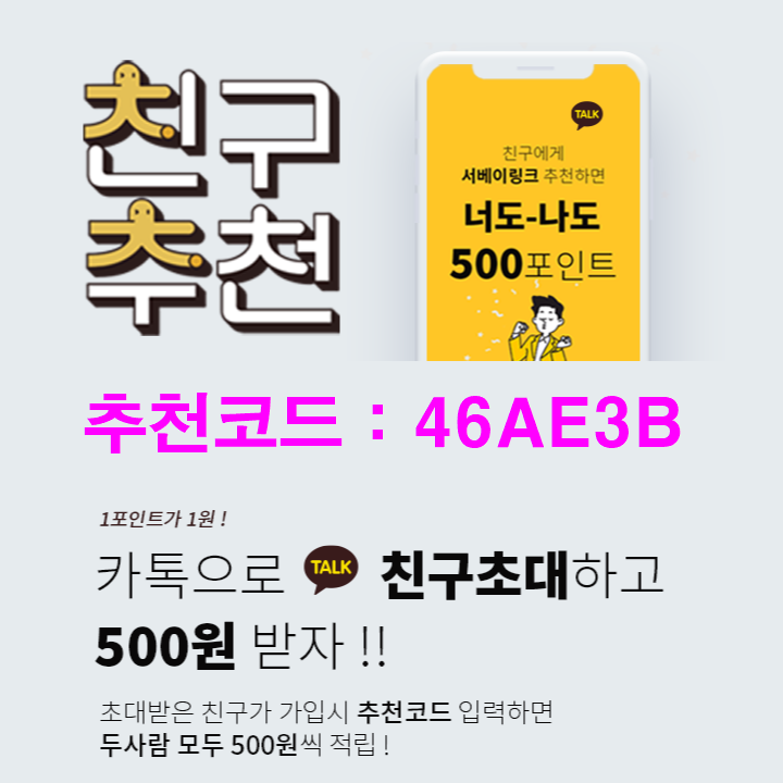 - 초대받은 친구가 가입시 추천코드 입력하면 두사람 모두 500포인트 적립!