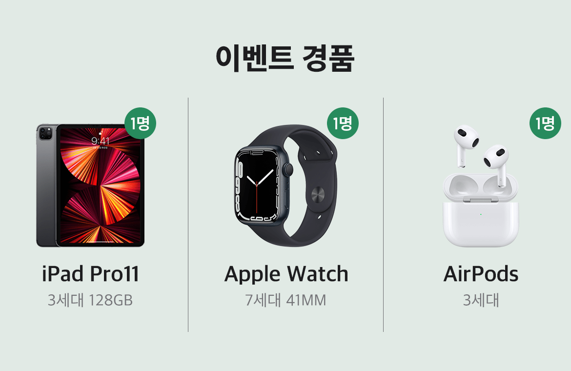 - 경품 : iPad Pro11 3세대 128GB(1명), Apple Watch 7세대 41MM(1명), AirPods 3세대(1명)
