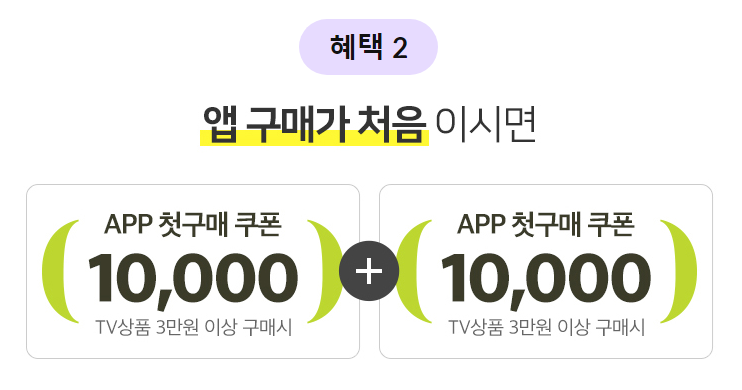 - 혜택2 : APP 첫구매 쿠폰 1만원(x2장)