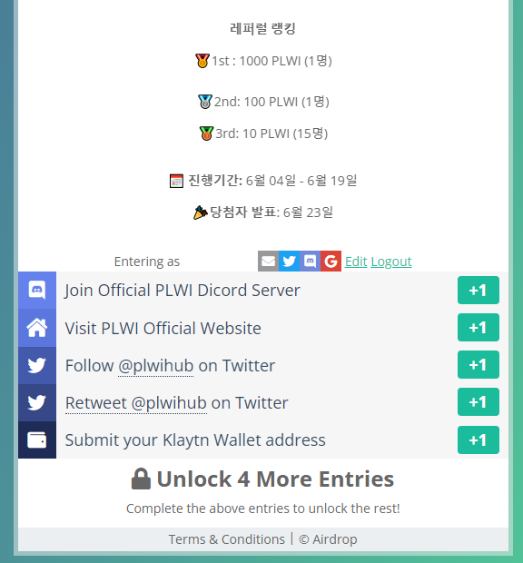 이번 이벤트에서는 미션 완료자 중 777명을 추첨하여 5 PLWI(1 PLWI = 0.343 KLAY)를 에어드랍 한다. 상위 추천자에게는 추천보상(1st 1000 PLWI (1명), 2nd: 100 PLWI (1명), 3rd: 10 PLWI (15명))을 지급한다. 트위터 팔로우/리트윗, 텔레그램 채널 가입, 미디엄 채널 팔로우 등을 완료하면 된다.