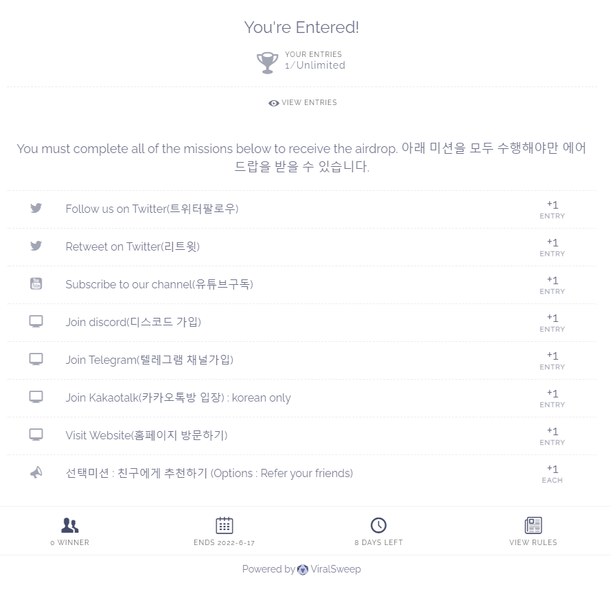 ▶ 참여방법 : 트위터 팔로우/리트윗, 텔레그램 채널 가입, 디스코드 채널 가입 등
