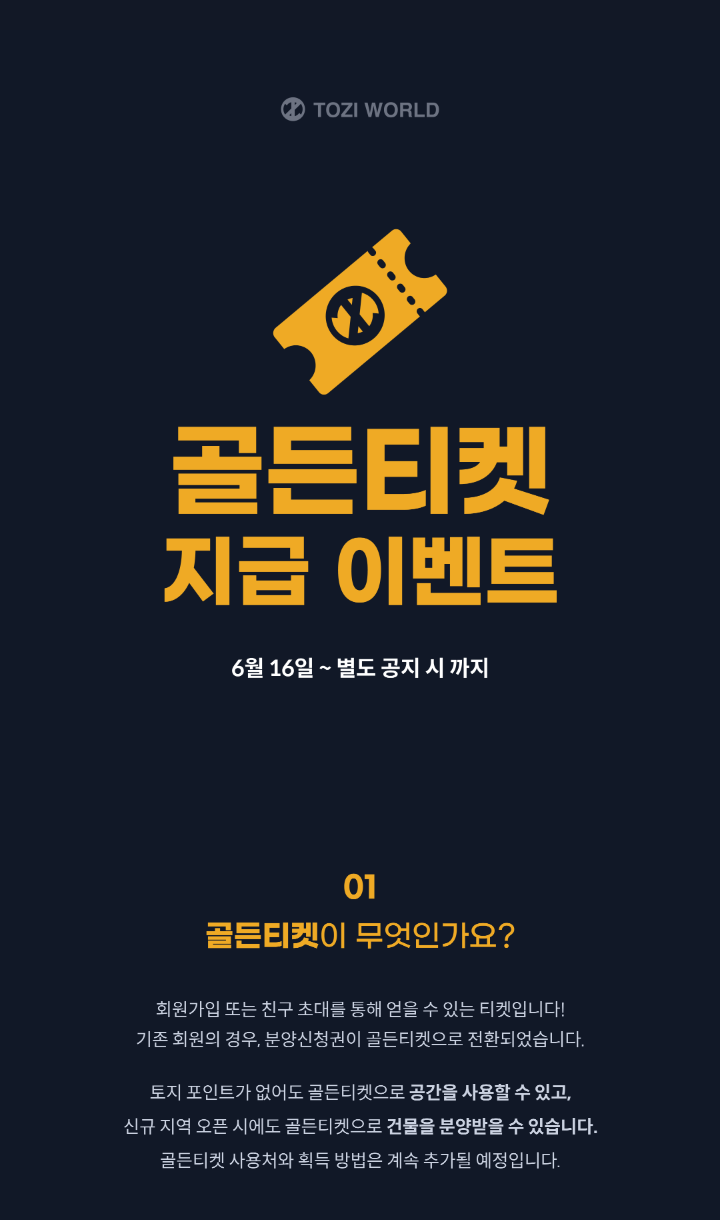 메타버스 가상 부동산 플랫폼 토지(TOZI)에서 6.16부터 골든티켓 지급 이벤트를 진행하고 있다.